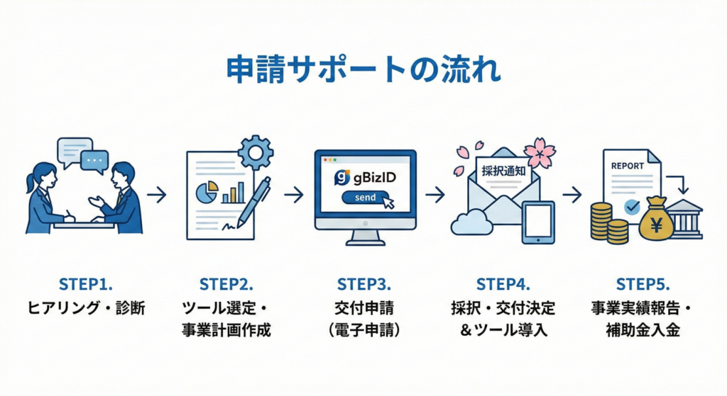 STEP1. ヒアリング・診断(無料) 貴社の課題や導入したいツールをお伺いし、申請要件を満たしているか診断します。 STEP2. ツール選定・事業計画作成 加点項目を考慮しながら、採択率を高めるための事業計画書を弊社にて作成支援します。 STEP3. 交付申請(電子申請) 「gBizID」を使用し、電子申請を行います。操作方法もしっかりサポートいたします。 STEP4. 採択・交付決定 事務局より採択通知が届きます。その後、ITツールの契約・導入を開始します。 STEP5. 事業実績報告・補助金入金 導入・支払いが完了したことを報告します。審査完了後、補助金が指定口座に入金されます。